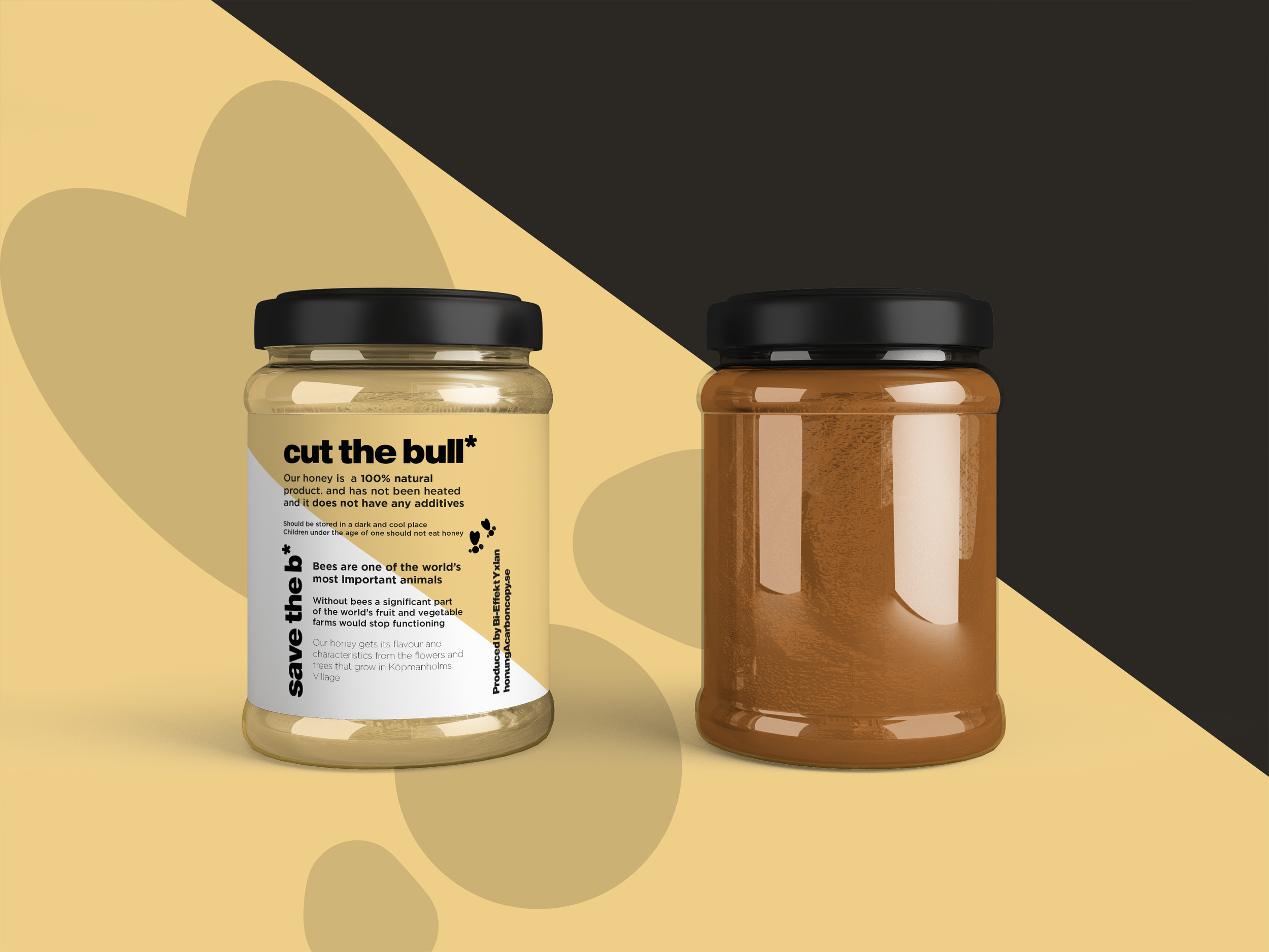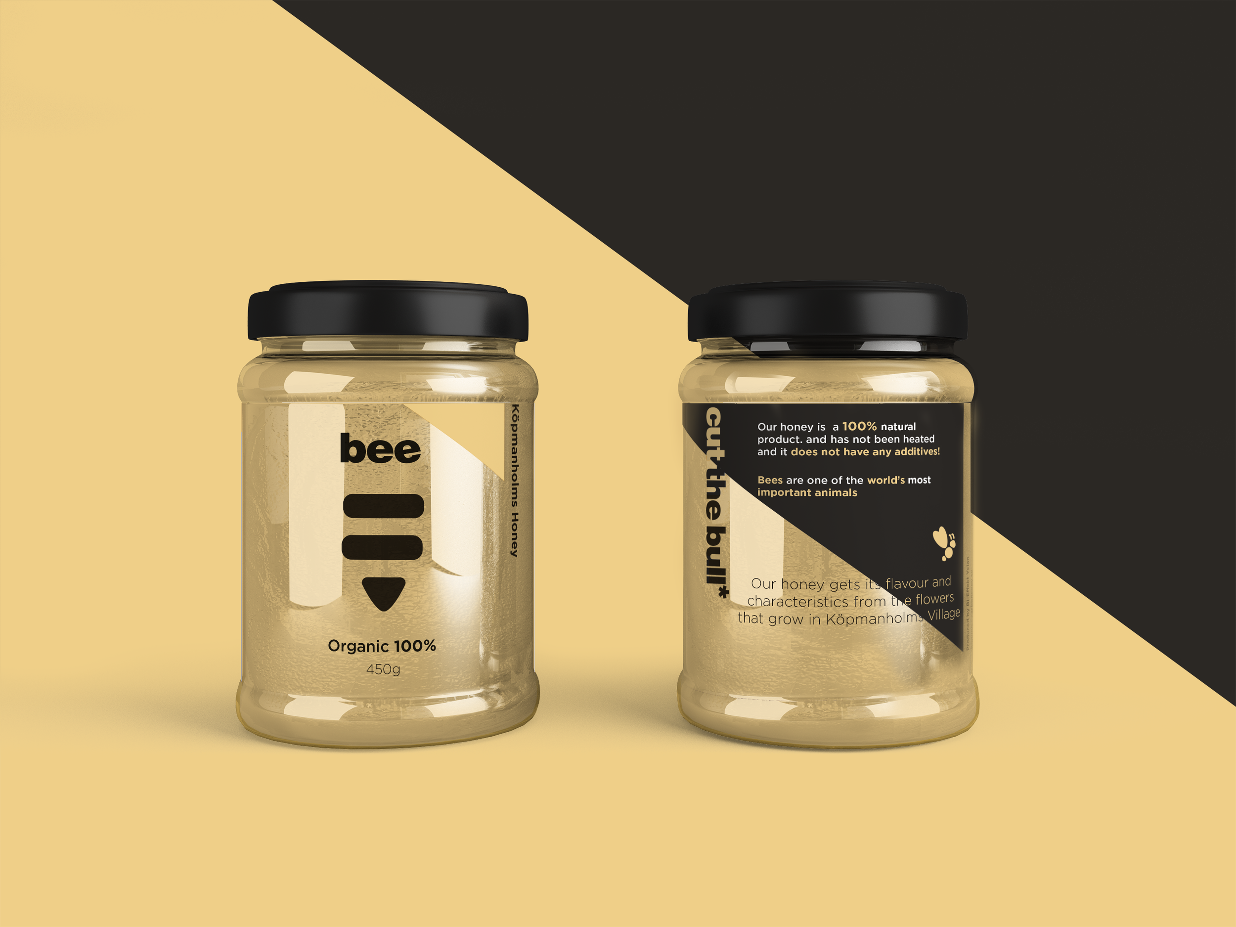 The yellow colour speaks about the honey and the bees. A cheerful hue that brightens up the design.